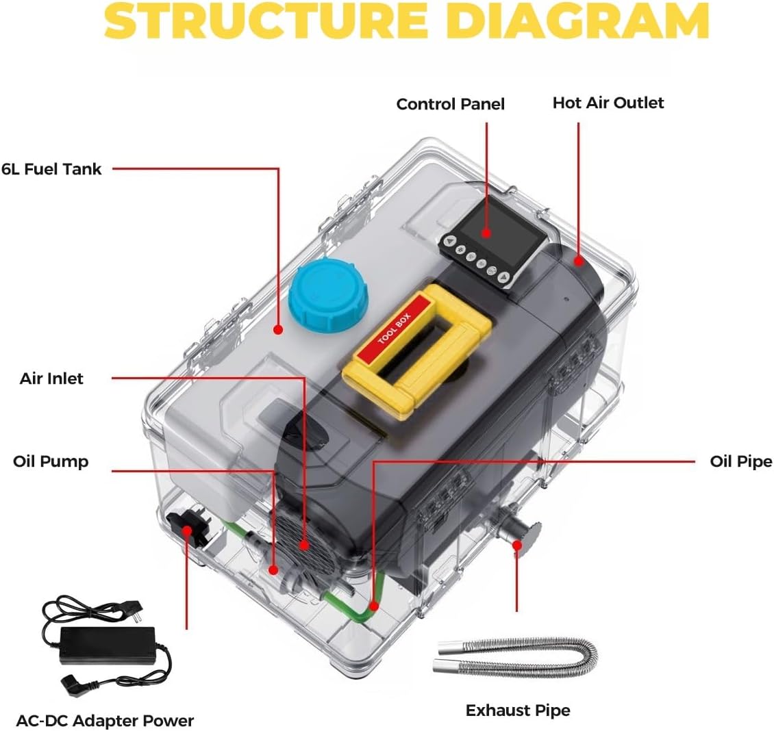 - Werkzeugkasten-Design: Der tragbare dieselheizung nimmt Metallschnalle Öffnung und Schließen, robuste Dichtung, vollständig versiegelte obere Abdeckung und vollständig eingebauten 6L-Kraftstofftank an. Integrierter Griff, platzsparender, einfach zu transportieren, zu installieren und zu warten, so dass es einfach zu bedienen ist und sorgenfrei ist, wo immer Sie gehen, egal ob es sich um einen Wohnmobil, einen LKW oder ein Abenteuer im Freien handelt