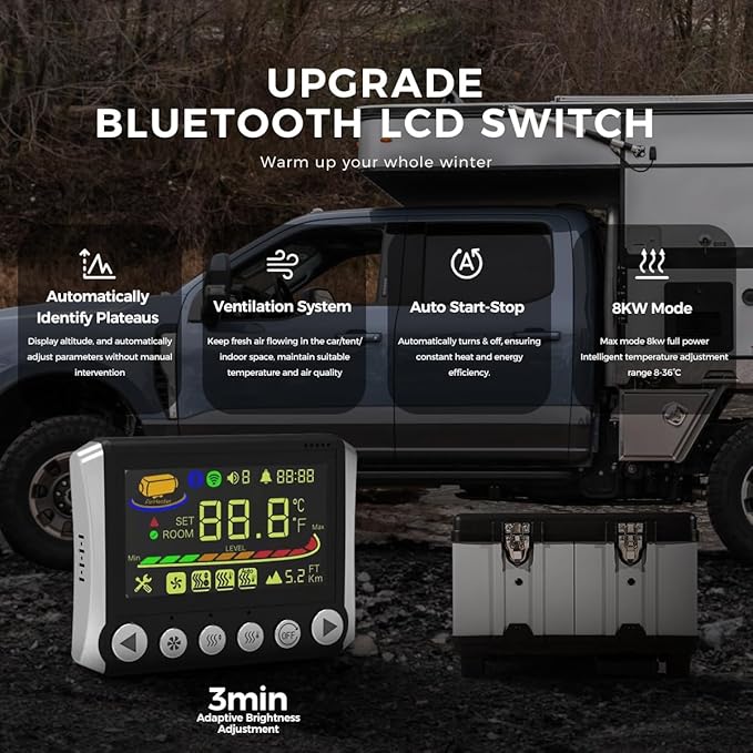 - Intelligente drei Steuerungen: umfassend steuern Sie das Heizungserlebnis über Bluetooth-Anwendung, Fernbedienung und LCD-Bildschirm. Die mobile App ermöglicht eine Ferntemperatursteuerung, Timer-Einstellung und Aktivierung mit einem Klick. Die Fernbedienung außerhalb des Autos kann das Fahrzeug im Voraus vorwärmen, um zu verhindern, dass die Fenster einfrieren; Der LCD-Bildschirm zeigt die Temperatur und den Status in Echtzeit an und warnt sofort auf Anomalien. Machen Sie Winterreisen bequemer und beruhigender